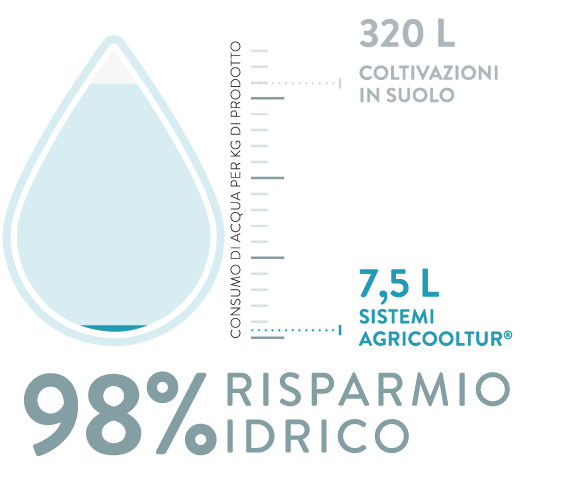 L’assenza del terreno e il ciclo chiuso dell’acqua nel sistema di coltivazione fuori suolo permettono di fornire alla pianta solo le sostanze nutritive necessarie per uno sviluppo sano e costante, evitando dispersioni.